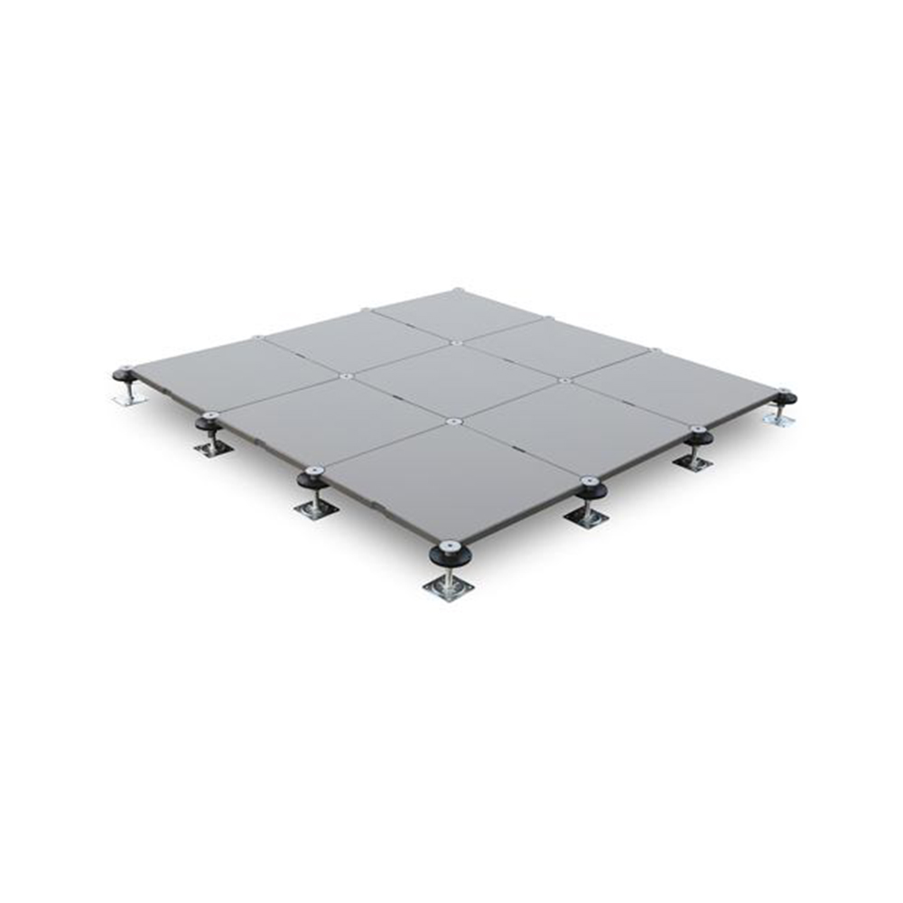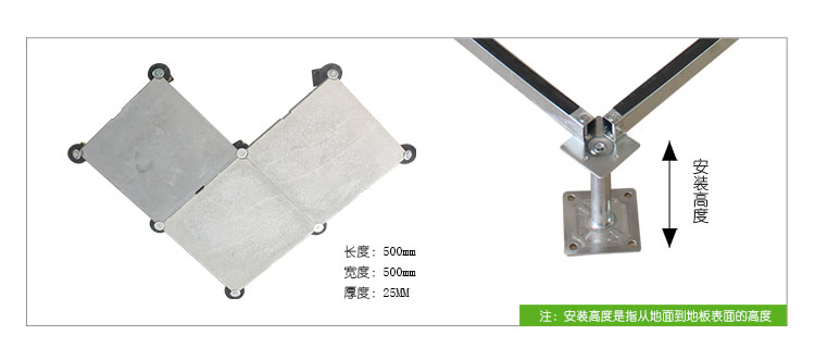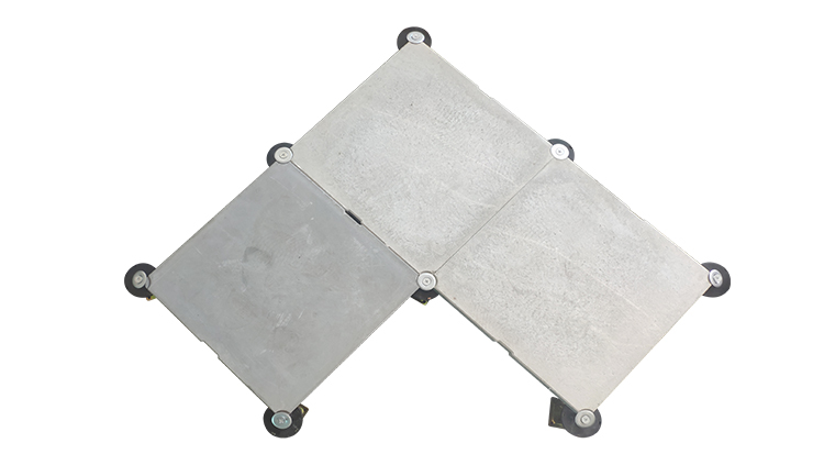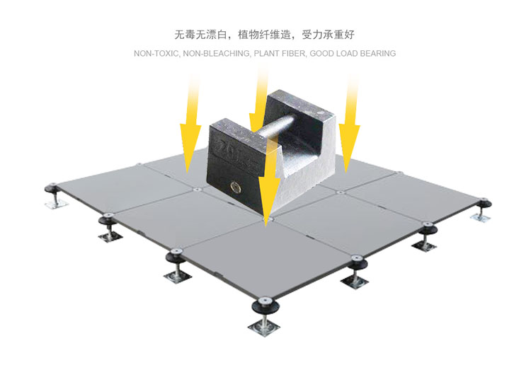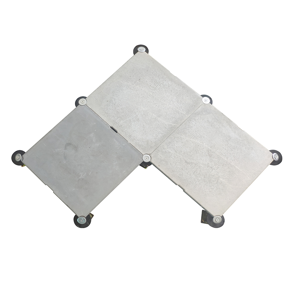 GRC水泥地板是由硅酸鹽、無(wú)機(jī)纖維、礦物纖維、石英砂等材料經(jīng)過(guò)高壓一次成型的環(huán)保地板,每塊地板自帶穿線孔。地板四角鍍鋅底座支承,不帶橫梁系統(tǒng)。每塊地板四角有90度圓弧,四塊板組合而成后形成一個(gè)圓,有一個(gè)鐵制螺母壓角固定。鋁頭上配有圓形緩沖定位橡膠墊,防止地板受力后顫動(dòng)引起的響聲。支架高度可調(diào)5cm。